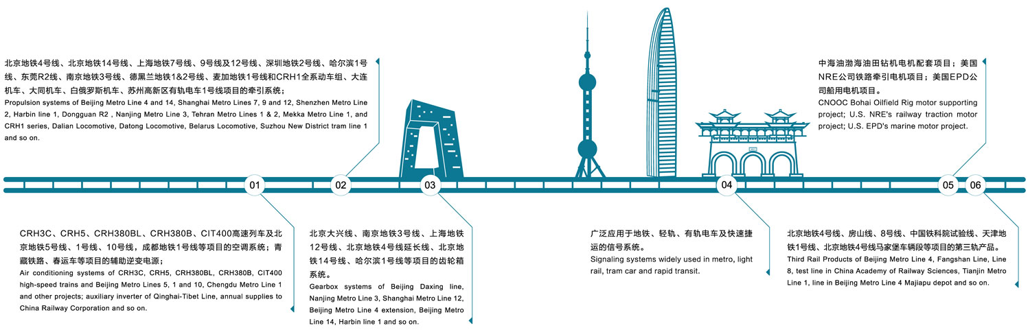 02.北京、上海、廣州、深圳、天津、成都、哈爾濱、南京、烏魯木齊、蘭州、廈門、東莞、佛山等20個國內(nèi)城市,和德黑蘭、麥加、曼谷等海外城市的地鐵,以及CRH1全系列動車組,大連、大同、白俄羅斯機車,南京、蘇州有軌電車,上海自動捷運系統(tǒng),蕪湖單軌項目的車輛牽引系統(tǒng);